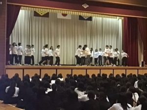 午後は『パフォーマンスの部』として、有志の生徒10組のチームがダンスや歌、コント、劇などを発表しました。発表者はとても堂々と披露し、見ている生徒は拍手をしたり声援を送ったりして、体育館にいる人が一体となって楽しむことができました。仲間の良さを認め合えた、とても充実した時間になりました。