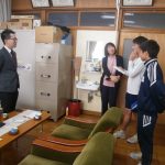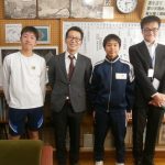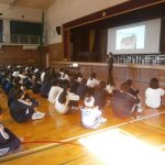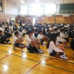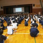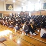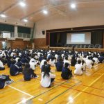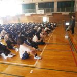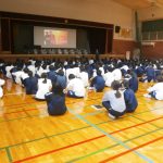 ひびきあい講師の澤井隆彰さんは、「発展途上国でボランティア」という夢をあきらめきれずに、就職して1年半後にJICAの試験を受け、海外協力隊としてウガンダに派遣され様々なボランティアに従事されたそうです。1年前の能登半島沖地震で友達の実家が被災したときには能登に足を運び、「不安な友達の隣にいること」「少しでも多く家の片付けを手伝うこと」「あたたかいごはんを一緒にたべること」を心掛けたとか。また、ウガンダの女性から、「あなた日本人ね」と言われその理由を尋ねたところ、「日本人は笑顔が素敵だから」と言われたそうです。そのときは、ウガンダの女性に優しさを届けた見知らぬ日本人を思い浮かべ、「優しさは連鎖する」ことの大切さに気づいたと、とびっきりの笑顔で話してくれました。生徒会長のお礼の言葉では、「ボランティアは身構えるのではなく、自分にできる小さなことをすればいいことを学びました」と話してくれました。また、校長先生からは、「今日の講師の方の考えが広がれば、いじめや紛争がなくなり、世界に平和が訪れる。されて嫌なことはしないことがやっぱり大事」との言葉をいただきました。