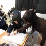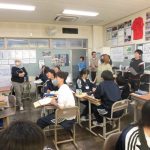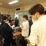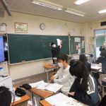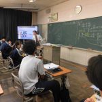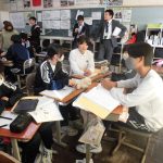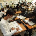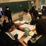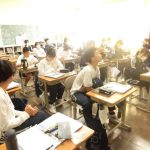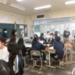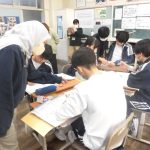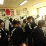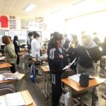 2-1の英語の研究授業でした。最上級(もっとも背が高い人は?)と比較級(どちらの山が高い?)の勉強でした。前半は、教科書をもとにその文法・使用例を学習し、後半はオリジナルの英文を作って仲間と交流しました(もちろん英語で)。和気藹々と学びを深めていく姿が印象的でした。