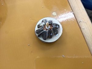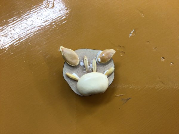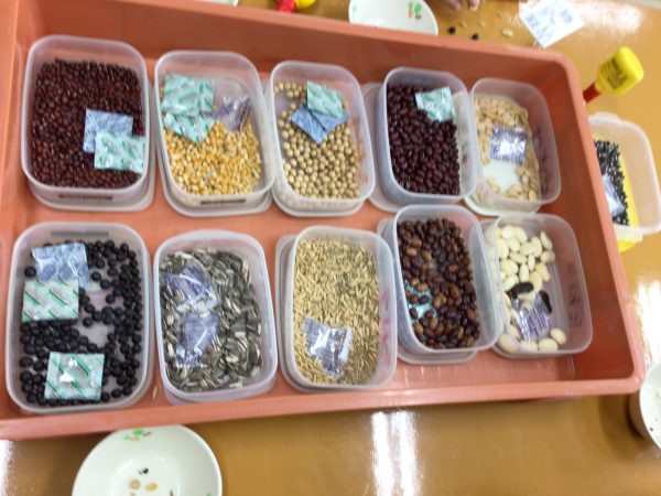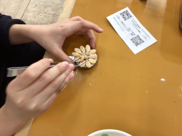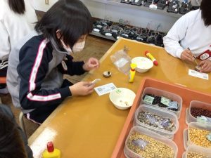 各務原市少年自然の家の先生方を講師としてお招きし、オリジナルマグネットを作製しました。材料は、木と種のみで、あとはそれぞれが工夫してオリジナル完成させました。11種類もの種があるため、デザインを考えるのも楽しめました。