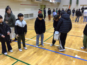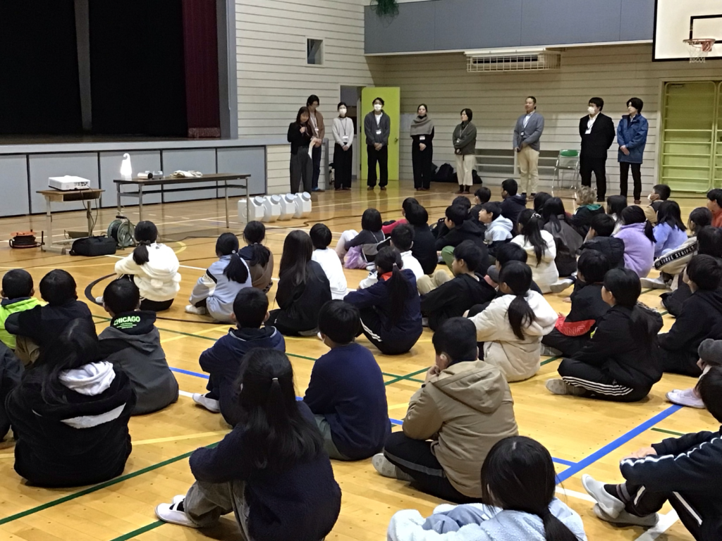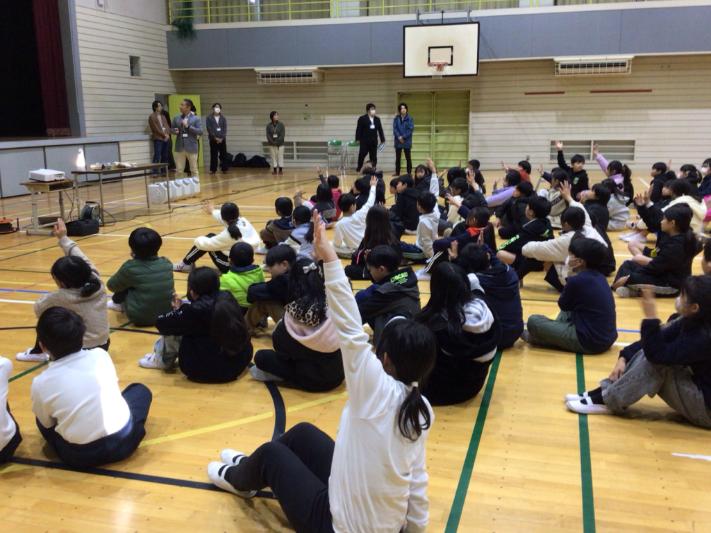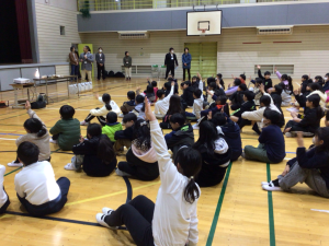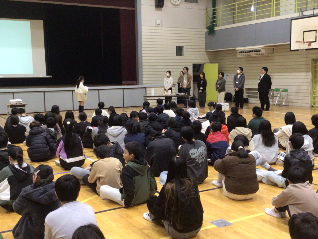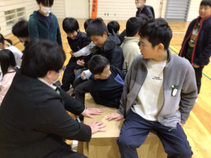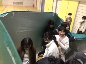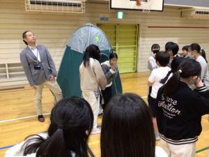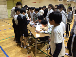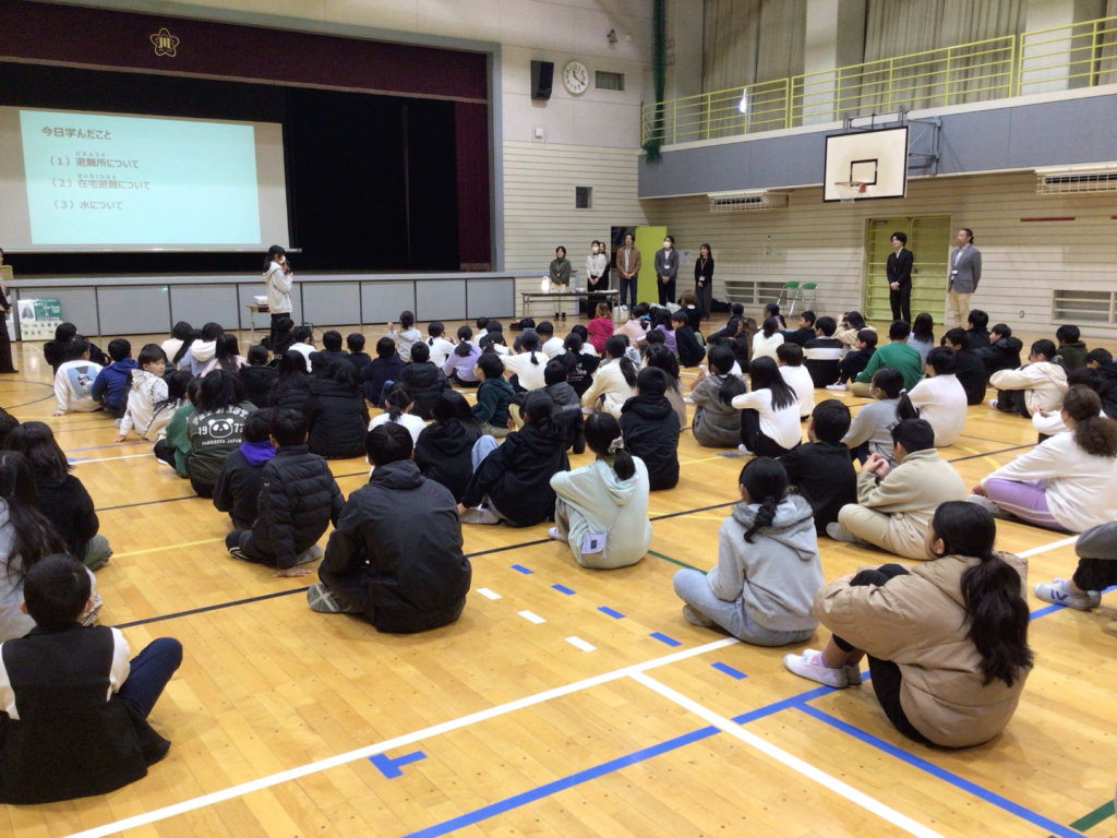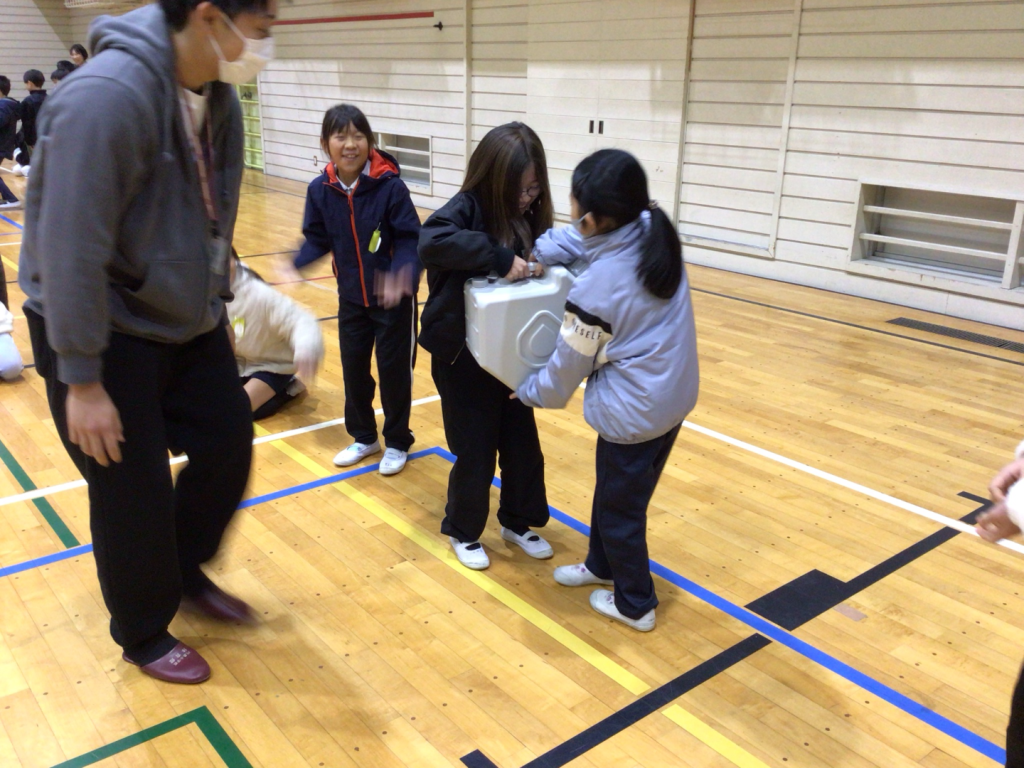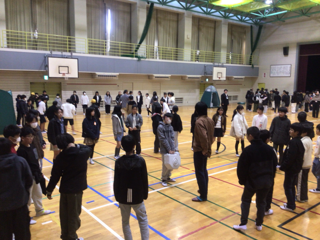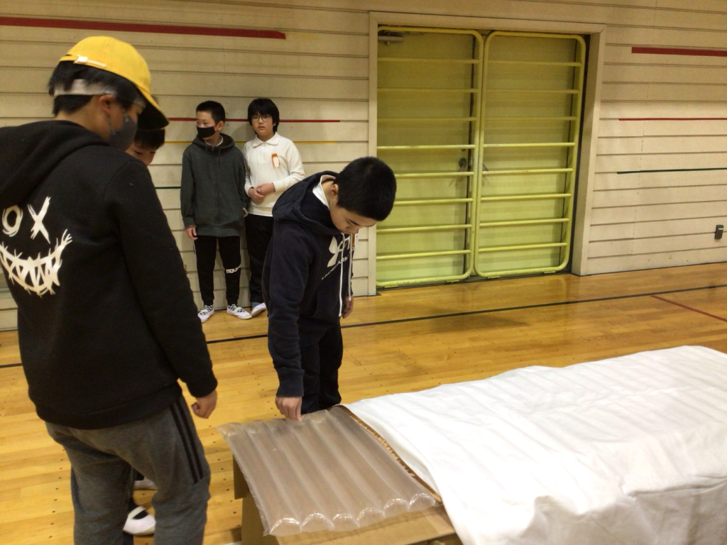 市の防災課と無印良品の方を招き、15日にオンライン学習、16日に学年ごとに体験学習を行いました。