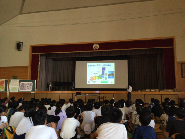 先日、国土地理院や測量協会の方に来ていただき、地図や測量について教えていただきました。始めに、様々な地図の種類や地図記号についてわかりやすく説明していただきました。地図記号のクイズもあり、最近新しく地図記号になったものなどを楽しく学ぶことができました。