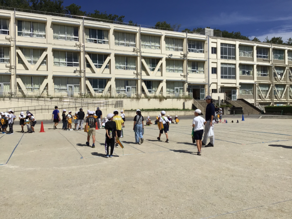 次の時間には、グラウンドに出て、自分の歩数でグラウンドに描かれた長方形の面積を求める、測量体験をしました。実際に使用されている測量の機械も見せていただき、貴重な体験をすることができました。
