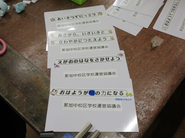 ホーム > PTA > 第4回学校運営協議会・三校合同子育て広場 2025/10/09 10月8日に学校運営協議会と那加中校区三校子育て広場の合同で挨拶を啓発する看板作りを行いました。那加中学校区では、毎年、学校運営協議会と各校のPTA研修委員会が、児童生徒の挨拶を家庭・学校・地域が連携しあって挨拶を活性化することに力を入れています。 今年は、花の苗を入れたプランターに児童から募集した60枚の挨拶看板を掲示する予定です。本日ご参加いただいた保護者の方々が真心を込めて素敵な挨拶看板をデザインしてくれました。今から、挨拶看板のプランターの完成がとっても楽しみです。 PTA 地域ボランティアの取組