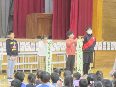 2年生のみなさんは、前の集会でがんばると宣言した、「あ・そ・ぼ・う」についての頑張りを発表しました。