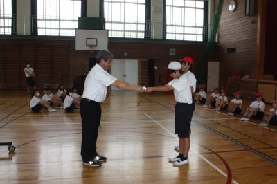 応援リーダーの皆さんへは、校長先生からハチマキと笛が手渡されました。