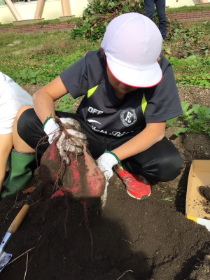 ホーム > 学校行事 > のぞみ サツマイモの収穫をしました 2025/10/30 2025/11/20 10月30日(木)は、のぞみ学級のみなさんの、サツマイモ堀の日でした。 1,2,3組合同で実施しました。 びっくりするような、とても大きなサツマイモが実っており、みんな大喜びでした。 学校行事