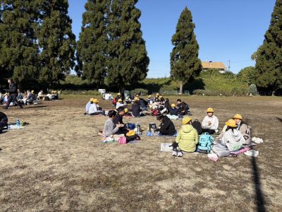 入所式の後、外に出てお弁当を食べました。天気が良く、温かで気持ちの良いお弁当でした。