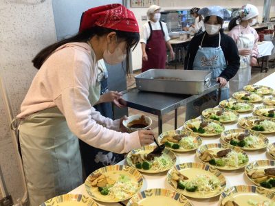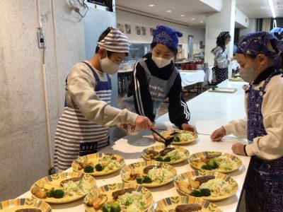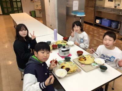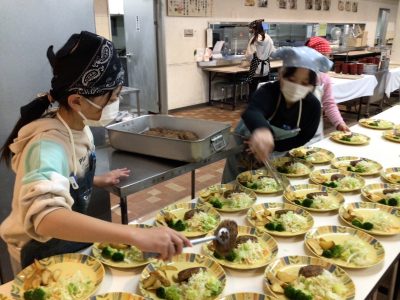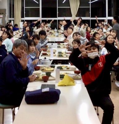 宿泊研修では、食堂で自分たちで配膳をして、自分たちで食べるようにします。