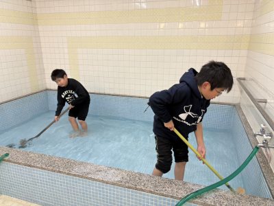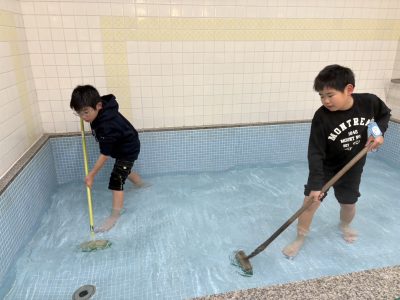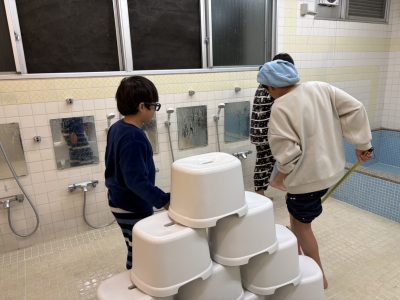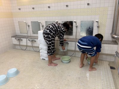 キャンドルサービスのあとは、入浴の時間でした。友達との入浴はとても楽しそうでした。最後のお風呂掃除まで、みんな一生懸命でした。