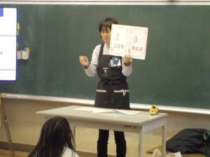 はじめに、子どもたちに「正しい本の扱い方」等、図書館を利用するときのルールやマナー、背表紙につけられた「本の番号」等についてのお話を聞きました。背表紙の「分類番号」については「この番号は、皆さんの住所につけられている郵便番号と同じですよ。」と教えていただきました。その後、子どもたちが事前に考えていた質問を一人一人順番に聞きました。「一番うれしいことは何ですか。」との質問には「私が読んでほしいなと思って選んだ本を、子どもが借りてくれた時です。」と笑顔で答えられました。