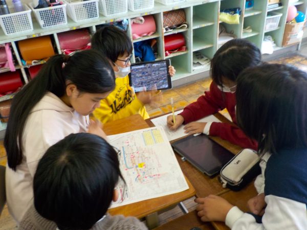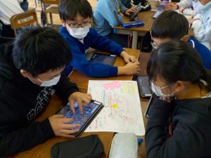 【1回目(12/4)】                                               子どもたちは、事前学習として、ふれあいマップに記載された自分たちの通学路を見直し、それぞれが「危険だと思う箇所」にシールを貼っていました。当日は5.6年生が入り混じり、通学路も異なるメンバーでグループをつくり、グーグルマップでシールを貼った現場の画像を見ながら、「どうしてその場所が危険なのか」「他にも危険性はないのか」等について意見交換をしました。毎日通っている通学路でも見逃している危険や、初めて現場を見た人だからこそ気づく危険等もあり、改めて「安全な登下校」について考えることができました。