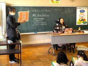 5年生総合「福祉」の学習として、講師の松山さんから「介助犬(さすけくん)」のお話を聞きました。現在、日本国内の介助犬の数は、約60匹だそうです。他にも「身体障害者補助犬法」という法律があり、その法律で認定されている補助犬として「盲導犬」や「聴導犬」という働きをもつ犬がいますが、どの犬も必要とされている方の人数に対して、絶対数が全然足りていないそうです。