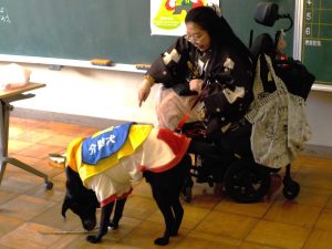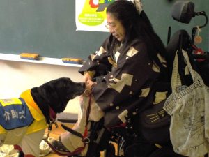 講話の後には、実際に介助犬がどのような働きをしているかを見せてくださいました。物を拾って松山さんの手元に届けたり、離れた場所にある携帯電話を探して口でくわえて持ってきたりと、松山さんの英語での指示をきちんと理解し、生活上の困難さの解消を手助けしている姿に感心するとともに、さすけくんの愛くるしい表情と働きぶりに愛しさも感じました。学校だけでなく、もっと社会全体で「福祉」についての理解を深めていかなければいけないと感じた時間でした。