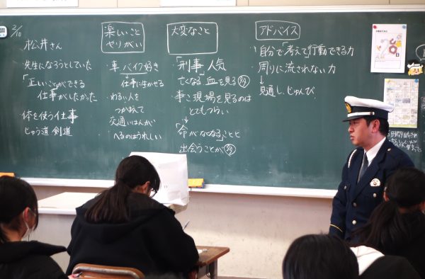 「正しいことを仕事にしたい」と就職。暴走行為などの違法運転の取り締まりを行う。悲惨な事故、飲酒運転を未然に防ぐことがやりがいである。人との挨拶、基本的な学業、コミュニケーション能力を大切にしてほしい。