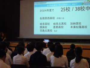 本校からも卒業生が通っている、美濃加茂高等学校、済美高等学校、岐阜県立岐阜各務野高等学校、岐阜県立各務原西高等学校の4校の先生方にお越しいただきました。どのようなことが学べるか、どのような学校生活を先輩が送っているのか、卒業後にはどんな進路を選択しているのかなど、それぞれの学校の特色を説明していただきました。