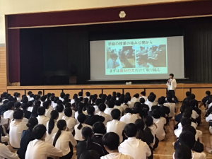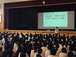 校長からは、半年間の個人の成長、学級の成長を確かめるとともに、授業や体育祭の取組の中での「自己決定 仲間とともに 自分が・自分から行動」からとらえたよさを伝えました。