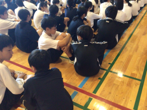 式の後に、生徒指導主事から生徒たちに考えてほしいことを話しました。一つ目はSNSのトラブルです。便利な道具ですが、使い方を誤って自分や周りの人を傷つけてしまうケースも本校でも起きています。もう一つは交通ルールについてです。来年度の4月1日からは16歳以上を対象として自転車のルール違反に青切符制度が導入されます。対象年齢ではありませんが、中学生も危険運転をしないようにすることが、自分や家族、周囲の人を大切にすることにつながります。