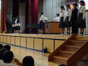 続いて、後期生徒会執行部と委員長の認証式を行いました。執行部の生徒たちには校長から、委員長には生徒会長から認証状を一人一人に手渡しました。