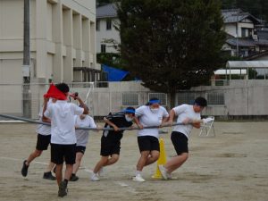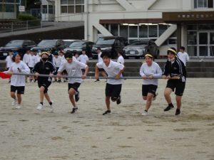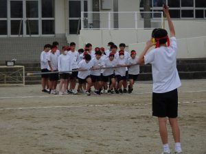 最後にもう一度「台風の目」を行いました。担当の生徒から、課題になったことを伝え、再度ルールを守って競技することを仲間に呼びかけました。それを受けて、議員が自分の学級の競技の様子を見ながら取り組んだ学級もありました。