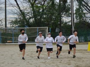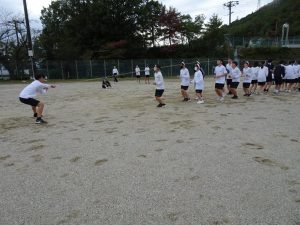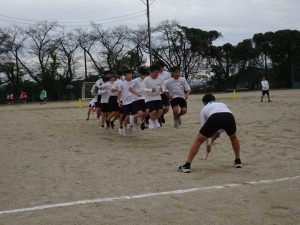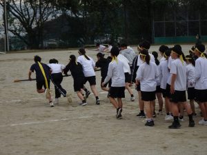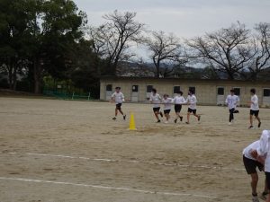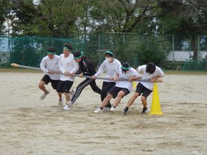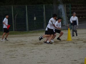まずは、「台風の目」からです。全員が棒をもつこと、安全に走ったりコーンを回ったりするために順手でもつことがルールです。走ることが得意な生徒もいれば苦手な生徒もいます。仲間のことも考えながら全員で走れるスピードにすることがポイントです。審判が横について走りながら、違反があればホイッスルを鳴らして知らせます。