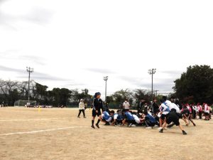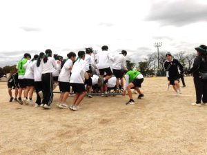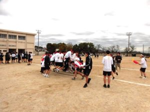 1年生から順に競技が始まると、係の生徒たちは駆け足で配置につき、本番さながらの緊張感の中で進行が行われました。競技中は、同じ団の縦割り学級から大きな声援が飛び交い、その声にこたえるように、一生懸命走り、跳ぶ姿が見られました。