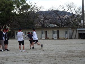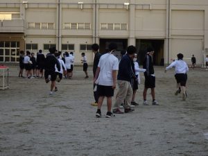 全校練習の後には、リレーの選手によるバトンパスの練習を行いました。グラウンドの状態が悪かったため、実際に走ることはしませんでした。団で集まって、コツを確認しているところもありました。
