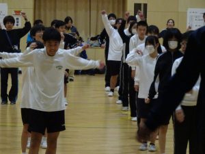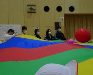 レクリエーション協会の方にもお世話になり、ボッチャ、ディスクゲッター、パラシュート、ジャンケン列車の4つのレクリエーションを楽しみました。いろいろな学校の仲間がいて少し緊張していた生徒たちですが、一緒に活動する中で言葉を交わしたりしてリラックスして取り組んでいました。楽しい時間を過ごすことができました。