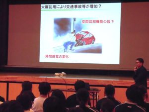 講座では、危険ドラッグをはじめ、タバコや大量のカフェインを含む清涼飲料水など、身近にも中毒性や依存性をもつ危険が潜んでいることを学びました。先生からは、一度の使用でも心身をむしばみ、人生を大きく狂わせてしまう薬物の恐ろしさについて、実例を交えながら分かりやすく説明していただきました。
