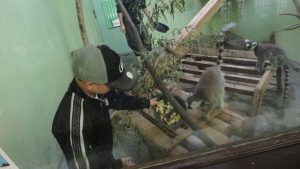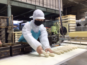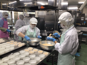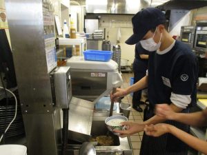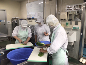 本校の給食室では、その日に提供する給食調理を担当しました。身支度も整え、食材を切ったり蒸しパンの種をアルミケースに入れたりしました。また、1年生の教室へ行って、普段栄養教諭が行っている給食指導も経験しました。