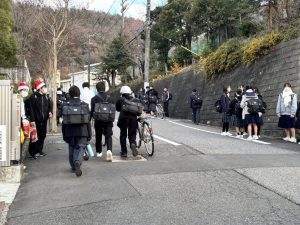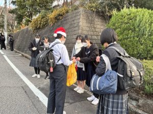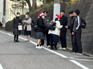 今週に入り、朝の校門にサンタクロースの帽子をかぶり袋を手にした生徒会執行部のメンバーが立って、登校してくる生徒たちにあいさつをしています。あいさつボランティアをこれまでも行ってきましたが、今週は、あいさつボランティアの輪をさらに広めたいと、あいさつボランティアに参加した生徒たちに執行部のメンバーがカードを配る「あいさつキャンペーン」を行っています。