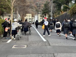 朝の校門にサンタ登場 ~生徒会あいさつキャンペーン~