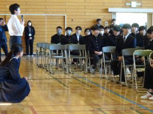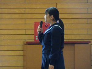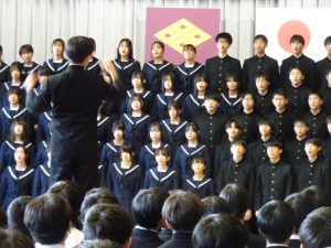 続いて、全校生徒で校歌を歌いました。文化委員長から「3学年が一緒になって歌うことは限られています。一緒に歌うことで伝統を受け継いでいくことになります。心を込めて歌いましょう。」と伝えました。全校で一つになって歌いました。