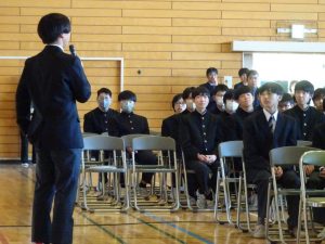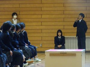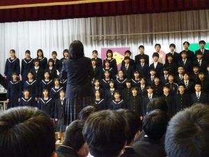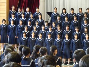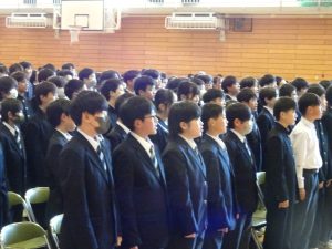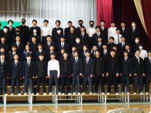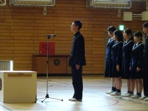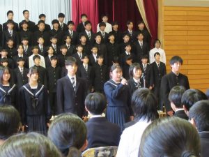 続いて、全校生徒で校歌を歌いました。文化委員長から「3学年が一緒になって歌うことは限られています。一緒に歌うことで伝統を受け継いでいくことになります。心を込めて歌いましょう。」と伝えました。全校で一つになって歌いました。