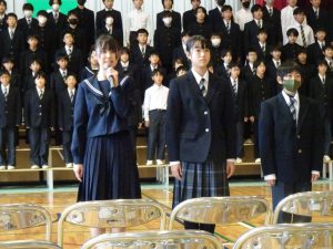 はじめの言葉では、代表生徒が「成長を実感し、進級や進学に生かすとともに、生徒会スローガン『光彩』の達成にもつなげてほしいと思います。鵜沼中の三本柱『学習・合唱・清掃』を3年生は1・2年生に託し、1・2年生は3年生から引き継ぎます。全力で練習の成果を発揮しましょう。」と投げかけました。